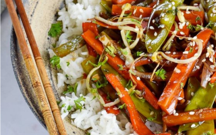 Delicioso y saludable Chop Suey vegano con tofu y arroz integral